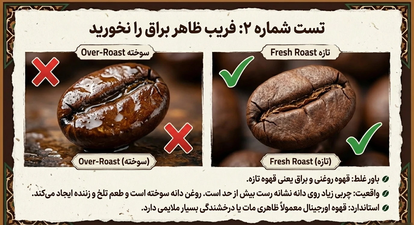 بسیاری فکر میکنند قهوه براق و روغنی یعنی قهوه تازه. اما حقیقت برعکس است! روغنِ روی دانه قهوه باید بر اثر فرآیند رست اصولی خارج شده باشد. اگر دانه بیش از حد چرب و سیاه باشد، یعنی قهوه “Over-Roast” شده و تلخی آن زننده و غیرطبیعی خواهد بود. در مقابل، قهوههای اورجینال معمولاً ظاهری مات یا درخشندگی بسیار ملایمی دارند.
